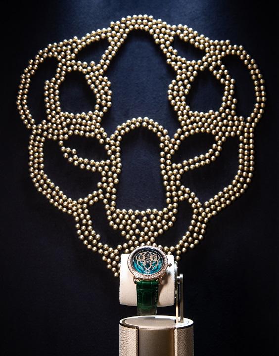 陳列櫃精挑細(xì)選出部分卡地亞最為珍貴的腕錶作品,例如其標(biāo)誌性的Panthère 腕錶,鋪鑲滿璀璨炫目的美鑽,體現(xiàn)奢華瑰麗之極致。另一款設(shè)計(jì)則雙眼綻放綠芒、綴有黑漆斑點(diǎn)的美洲豹首傲然置於錶殼之上,展現(xiàn)自信迷人的女性魅力。當(dāng)你的目光落在巧奪天工的Révélation d’une Panthère 腕錶上,你會看到一個(gè)黃金美洲豹首,神奇地隨著手腕擺動忽隱忽現(xiàn)。這款以塗漆錶面配上祖母綠色錶帶,簡潔大方而精緻優(yōu)雅,是高貴節(jié)日造型的絕配。